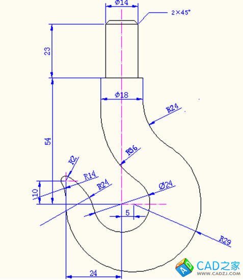 繪圖步驟:建立三個圖層,分別為繪圖、尺寸標注、輔助線圖層;確定相關尺寸繪制輔助線,先作直徑24和R29的圓,再畫出圖形上部的矩形框和倒角部分;再作R24和R36的圓分別與豎直直線和前面兩個圓相切,修剪多余線段和圓弧。用同樣的方法畫左側的圓R2和相關的相切圓再修剪多余圓弧即可完成,最后進行尺寸標注。