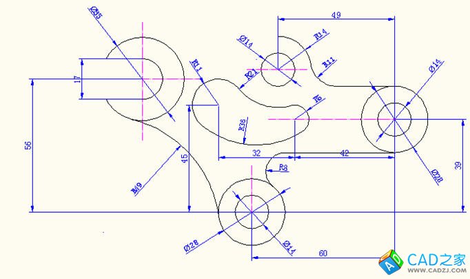 繪圖步驟:建立三個圖層,分別為繪圖、尺寸標注、輔助線圖層;確定相關尺寸繪制輔助線,先畫兩部分直徑為14、28 的兩圓,再畫直徑為17、35的兩圓,分別使用通過象限點畫水平線與圓相切、使用畫圓中的T 畫相切圓完成各部分的直線和圓弧相切;圖形的中間部分為兩個圓與兩段圓弧相切,畫法與之前相同。圖形最上部圓心的確定是使用輔助線畫法來確定,依次可以完成相關圓和圓弧的相切;修剪多余的線段和圓弧即可完成整個圖。最后進行尺寸標注。