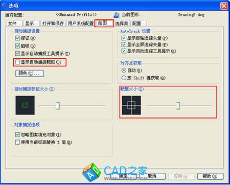 捕捉靶框的大小和是否顯示都可以在“選項”對話框中設(shè)置,如下圖所示。