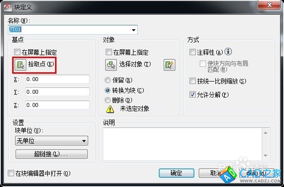 選中圖形按B鍵定義塊,自定義名稱為JT01,點擊拾取點