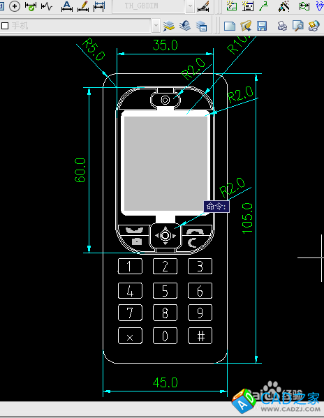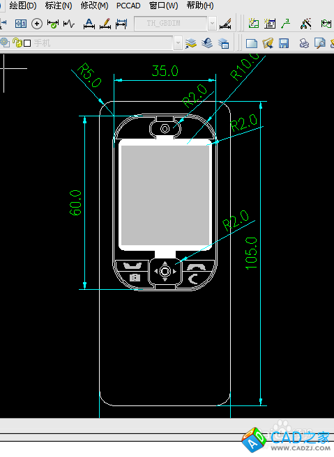 手機屏幕:先畫一個60x35的矩形,倒角45°,半徑為10,再向外拉伸多0.5的相同圖像,如圖: