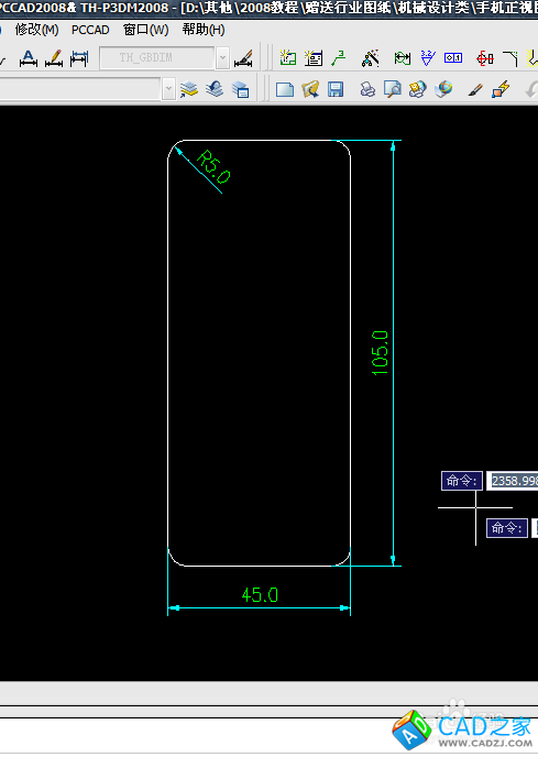 打開CAD,先畫一個矩形,尺寸105x45,可以用快捷鍵L,也可以直接拉矩形。然后用倒角F,把矩形的4個角都倒半斤為5的倒角,如圖: