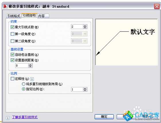 “約束”選項組用于控制多重引線的結構。“基線設置”選項組用于設置多重引線中的基線。“比例”選項組用于設置多重引線標注的縮放關系。“內容”選項卡用于設置多重引線標注的內容。如下圖所示。