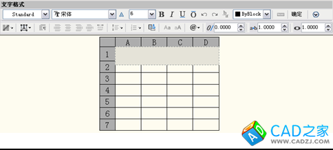 此對話框用于選擇表格樣式,設置表格的有關參數。其中,“表格樣式”選項用于選擇所使用的表格樣式。“插入選項”選項組用于確定如何為表格填寫數據。預覽框用于預覽表格的樣式。“插入方式”選項組設置將表格插入到圖形時的插入方式。“列和行設置”選項組則用于設置表格中的行數、列數以及行高和列寬。“設置單元樣式”選項組分別設置第一行、第二行和其他行的單元樣式。通過“插入表格”對話框確定表格數據后,單擊“確定”按鈕,而后根據提示確定表格的位置,即可將表格插入到圖形,且插入后AutoCAD彈出“文字格式”工具欄,并將表格中的第一個單元格醒目顯示,此時就可以向表格輸入文字,如下面的圖所示。