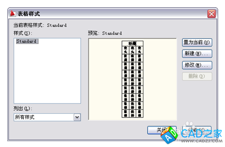 單擊“樣式”工具欄上的 (表格樣式)按鈕,或選擇“格式”|“表格樣式”命令,即執行TABLESTYLE命令,AutoCAD彈出“表格樣式”對話框,如右下圖所示。其中,“樣式”列表框中列出了滿足條件的表格樣式;“預覽”圖片框中顯示出表格的預覽圖像,“置為當前”和“刪除”按鈕分別用于將在“樣式”列表框中選中的表格樣式置為當前樣式、刪除選中的表格樣式;“新建”、“修改”按鈕分別用于新建表格樣式、修改已有的表格樣式。