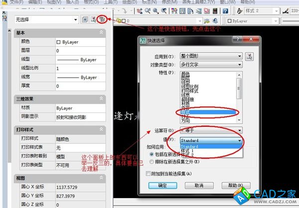 然后難點到了,在CH特性面板上,點擊快速選擇圖標,按照圖片上的提示,快速選擇所有樣式1的文字,確定,然后所有樣式一的文字都被選中了,再在特性面板上統一把樣式1的文字修改成樣式二的文字。