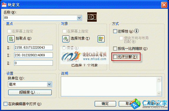 2、另一種不能分解的原因是在創建塊時,將“允許分解”前面的對鉤去掉了,如下圖所示