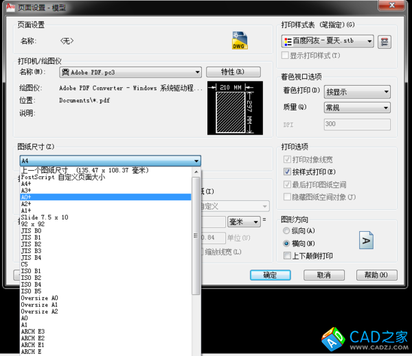 上述繪圖區域的設置可在打印設置對話框中采用Adobe PDF虛擬打印機后,用其右側的特性按鈕進行修改-在彈出的對話框中再點擊“自定義特性”(下圖一),在新的彈出的對話框中,接著點擊右下角的“添加”按鈕(下圖二),在再次彈出的對話框“添加自定義頁面大小”(下圖三)就是打印區域的設置界面。在起好一個打印區域的名稱(建議和圖幅對應,這里建議采用A0+,+號代表比A0大些),之后一路確認即可。以后在打印時,就可在圖紙尺寸的下拉清單中看到和選擇這個A0+了(下圖4),然后還可以如法炮制繼續定義其它的打印區域。
