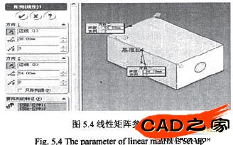選取閥體的頂面,在此基準(zhǔn)面上繪制一直徑為14mm的圓。同樣,還要標(biāo)注圓心的位置,然后選擇特征工具欄的切除拉伸工具,切除深度設(shè)置為11mm。按照上述方法在新切出的圓面上以此圓為圓心繪制一個(gè)直徑9mm的圓,然后切除深度設(shè)為完全貫穿。點(diǎn)選線性陣列工具,參數(shù)設(shè)定如圖5.4所示,在要陣列的特征中選取剛才做的那兩個(gè)拉伸切除。至此完成了閥體螺紋孔的繪制。