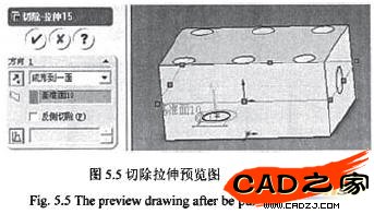 點(diǎn)擊標(biāo)準(zhǔn)視圖工具的下視,選取閥體的底面,在此面上繪制一直徑為24.3mm的圓。點(diǎn)擊標(biāo)注工具確定圓心的位置,然后選擇切除拉伸工具,切除深度設(shè)置為2.65mm。在閥體頂面與底面等距處作義基準(zhǔn)面10,在切除后的平面上繪制直徑17ram的圓,拉伸切除,深度設(shè)置為成形到一面,此面就是基準(zhǔn)面10。如圖5.5所示。