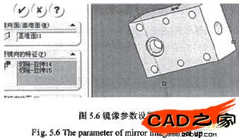 在通過(guò)圓心并與側(cè)面平行作一基準(zhǔn)面11。點(diǎn)擊特征工具里的鏡像工具選取基準(zhǔn)面11為鏡像面,將兩個(gè)拉伸切除為鏡像特征。如圖5.6所示。