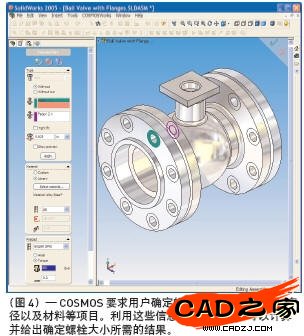 (圖4)—COSMOS要求用戶確定螺栓將接觸的面、螺栓直徑以及材料等項目。利用這些信息,COSMOS就可以計算并給出確定螺栓大小所需的結果。