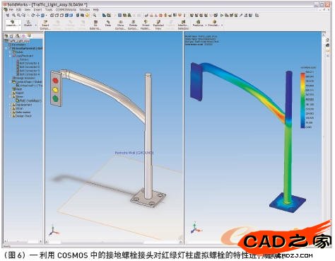 COSMOS還可以模擬接地螺栓的特性,例如紅綠燈柱(圖6)上的螺栓的特性,在這種情況下,螺栓是嵌入到人行道的混凝土中的。對于接地螺栓,COSMOS使用虛擬壁選項模擬混凝土地面,因而減小了分析模型的大小。