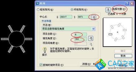 用“陣列”命令,工具欄是四個小方塊圖標那個,命令行是array 點擊陣列,彈出對話框,設置圓心,設置角度(環繞就是360°了),設置個數,點取要壞繞的塊對象,預覽一下看看,合適就OK啦。 上圖說明下你就明白了: