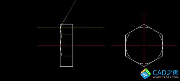 在螺栓法蘭上,以六邊形內切圓半徑值從中心做等距線,從交點做30°線與法蘭外側線相交,過交點做上下面平行線,使用三點圓弧命令,連接內側兩交點以及法蘭頂面中點。