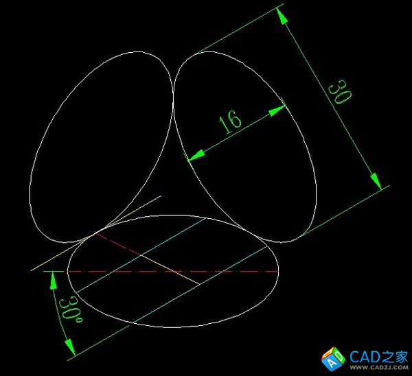 2、過此交點畫30°線,即為兩橢圓公切線,鏡像橢圓即可完成