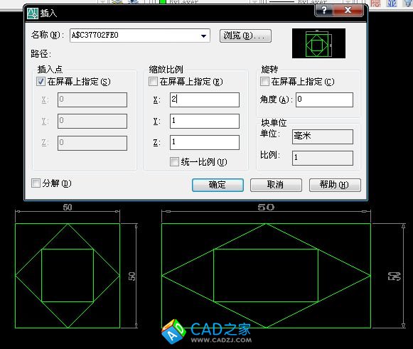 然后菜單欄之插入---塊,出現(xiàn)插入對話框,里面有個預覽圖,就是剛才那個塊。如下圖,改X的比例,Y的不變,或是改Y的比例,X的不變,確定插入后就是單方向拉長或縮短了?,F(xiàn)在尺寸是不對的,分解一下就對了。