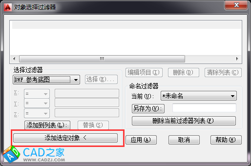 1.在命令行中輸入“FI”回車,出現下圖的對話框,然后點擊【添加選定對象】,選擇要計算樁的塊,最后應用即可