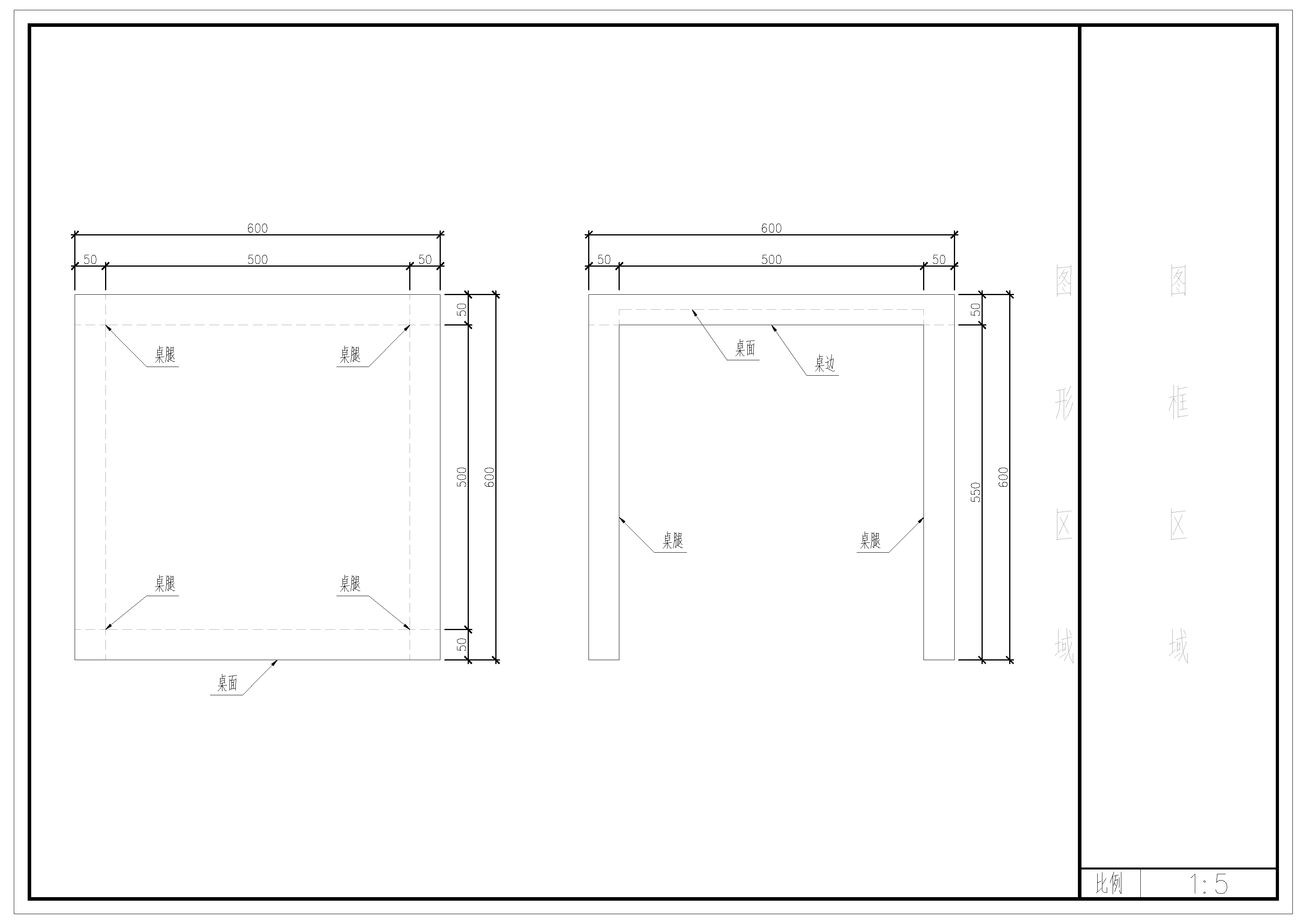 圖1與圖2為同一張桌子在不同比例的A3圖紙下的樣子,可以看到,在比例由1:5變成1:10后,桌子在圖中的大小也變成了原來(lái)的1/2。需要注意的是,圖中實(shí)體類(lèi)的圖元大小發(fā)生了改變,而如標(biāo)注、說(shuō)明文字等注釋類(lèi)的圖元,其大小卻是不變的。