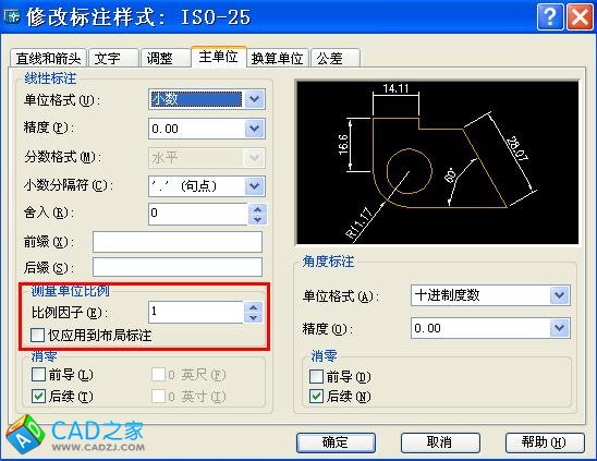 圖中DIMLFAC=1,這是缺省設置值。如果我們把圖上顯示的尺寸值稱為尺寸標注值的話,那么:尺寸標注值=實際測量值×測量單位比例因子。