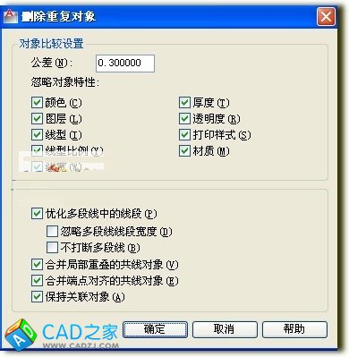 彈出“刪除重復(fù)對(duì)象”對(duì)話框。在這里設(shè)置清理參數(shù)即可。