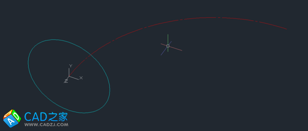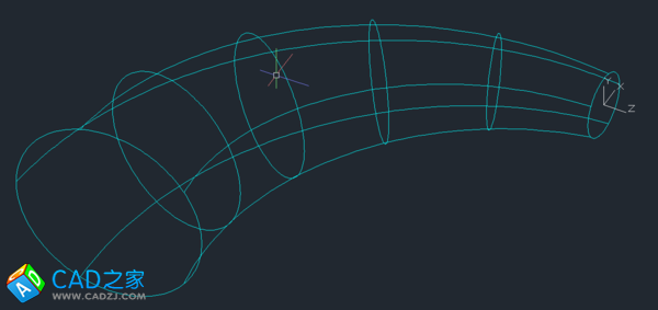 1. 在平面中畫出彎管的中心線——一段圓弧作為放樣的路徑,把UCS放到弧的一端并旋轉UCS到與繪制的中心線垂直,在新UCS平面中繪制圓錐管大頭的外圓(先繪制小頭也一樣)