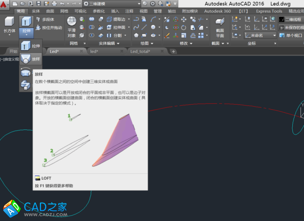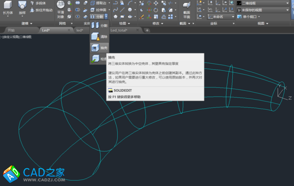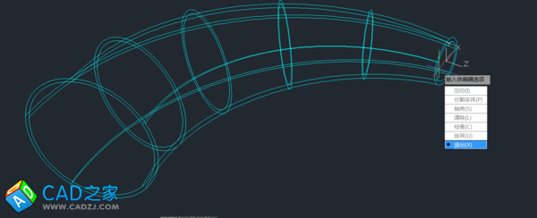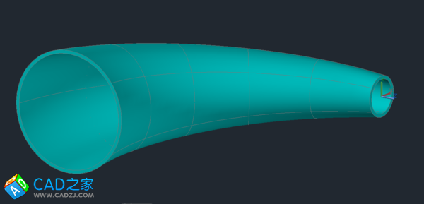 4. 對放樣后的三維實體抽殼——抽去中間部分,留下外邊的管壁,抽殼命令后,先選擇三維實體,再選擇要刪除的平面——兩個圓平面,最后輸入殼體厚度(管壁厚度)。