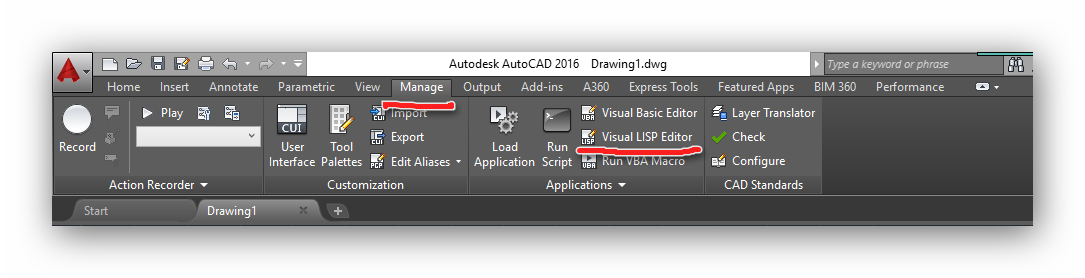 2. AutoCAD2009及之后的版本, 在功能區(qū)的”管理“選項(xiàng)卡里可以直接打開(kāi)Visual Lisp編輯器。
