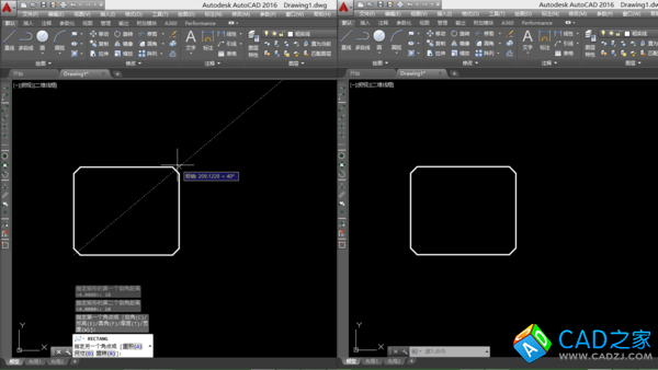 如圖所示,提示“指定第一個角點”和“另一個角點”,根據需要單擊指定角點,結果如圖中右側部分所示。