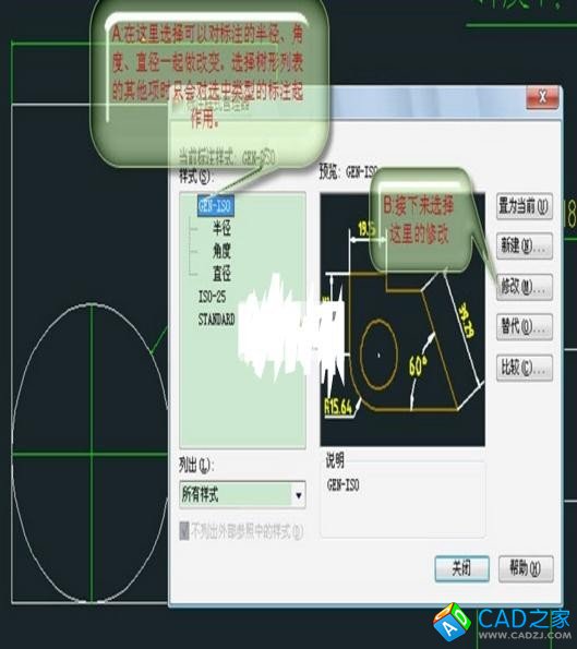 第二步:在經(jīng)典菜單欄中選擇【格式】-【標注樣式】。在這里選擇要修改的標注樣式,可以對所有的標注進行修改,也可以選擇圖中的半徑、角度、直徑做分別修改。
