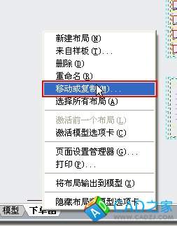 1、 在布局空間中右鍵單擊布局標(biāo)簽,在右鍵菜單中選擇“移動或復(fù)制”,如下圖所示。