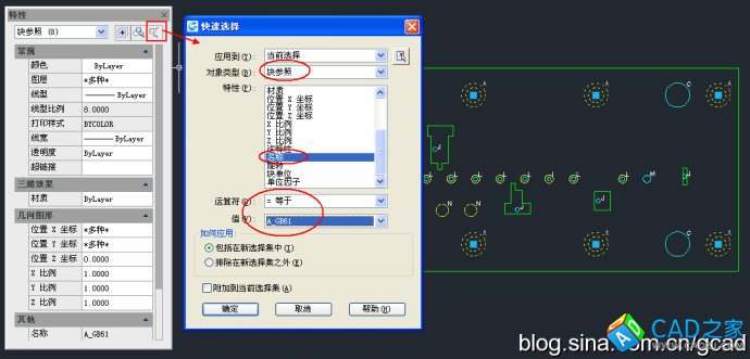 我們需要統(tǒng)計(jì)某種圖塊的數(shù)量或者全部刪除某種圖塊的時(shí)候也這個(gè)功能也很方便,會(huì)自動(dòng)將同一圖層上的同名的圖塊過(guò)濾出來(lái),如下圖所示。