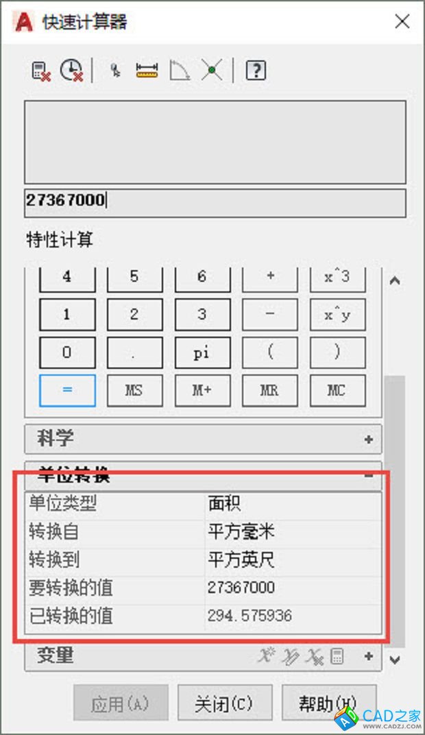 在特性面板中單擊面積文本框,后面會出現一個計算器圖標,單擊此圖標,可以打開CAD自帶的快速計算器,如圖所示。