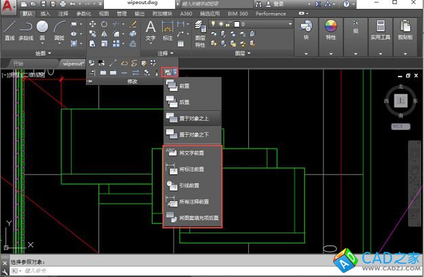 前置就是將選中的圖形放到最前面,后置就是將選中的圖形放到最后面。而置于對象之下和對象之上,是可以選擇一個參考圖形,讓選中的圖形在此圖形的下面或上面。大家用與上面例子中類似的圖塊,或建幾個重疊的SOLID填充試一下就很清楚了。