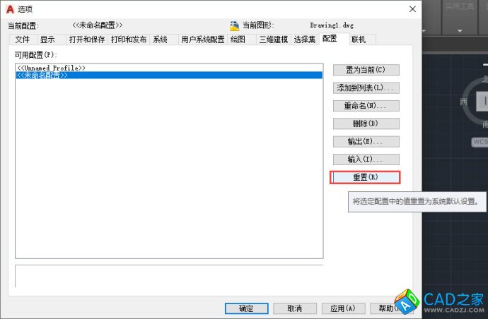 輸入OP,回車,在選項對話框中單擊配置選項卡,在配置選項卡中選擇一個配置,默認(rèn)為:未命名配置,單擊重置按鈕,如圖所示。