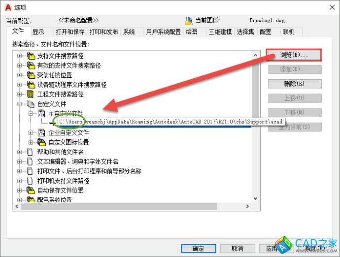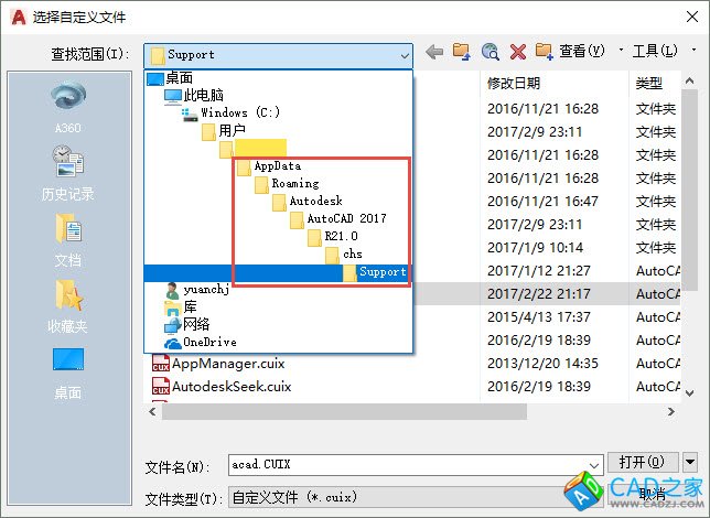 CAD起作用的自定義文件在當(dāng)前用戶的APPDATA目錄下,目錄層級非常深,我數(shù)了數(shù),有九層,如下圖所示。