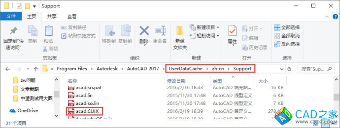 不同的版本位置基本類似,只是版本號不同,大家如果找不到這個路徑,可以在C盤搜索一下acad.cuix。