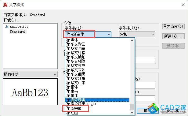 我們可以直接在文字樣式對話框中看一下,啟動CAD后新建一個空文件,輸入ST后回車,打開文字樣式對話框,我們可以看一下字體列表,可以看到有一系列帶@的字體,下面還有同名不帶@的字體,如下圖所示。