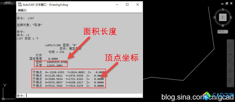 繪制一條有多個頂點的多段線,選擇多段線,輸入LI,回車,就會彈出一個文本窗口,此多段線的相關數據就全部都列舉出來了,如圖所示。