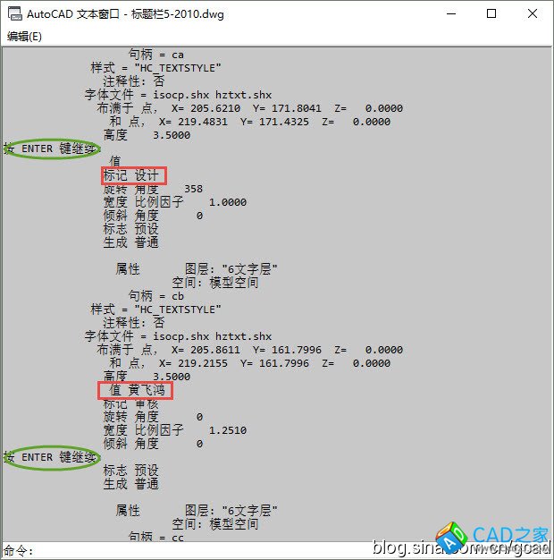 如果要提取更復雜圖形的數據就沒那么方便了,假設我們要提取一個屬性圖塊(如果圖框的標題欄中)的數據,如果用LI查詢顯然就不行了。輸入LI后,你可能需要回車多次才能將圖塊的數據都顯示出來,而且屬性的標記和值之間都會隔好多行,要摘出來可不容易,如圖所示。