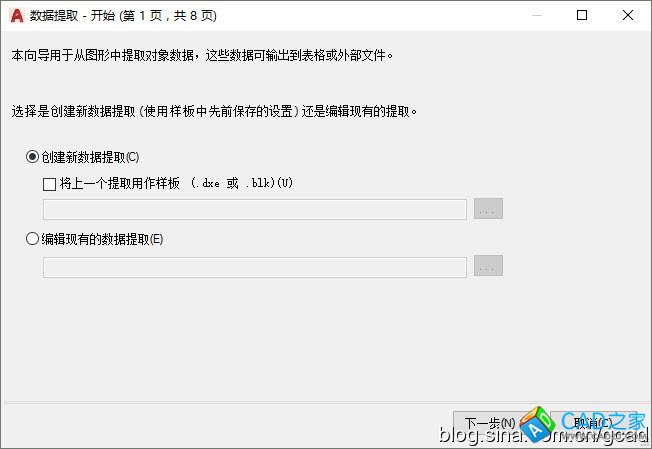 執行數據提取命令后,會彈出一個操作向導,指引我們一步步完成操作。首先彈出的是第一頁,可以創建新的數據或編輯現有數據,在創建新數據提取的時候可以用以前提取的數據作為樣板。