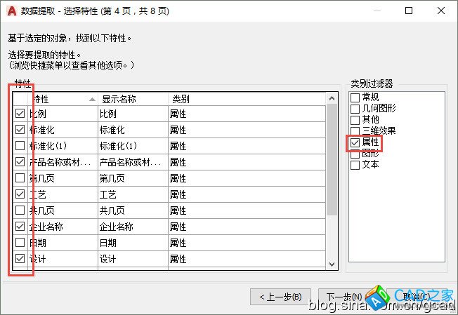 這一頁就跟LI查詢時一樣,還是列出了好多的數據。為了過濾這些數據,在對話框右側提供了類別過濾器,左側則列出了此類的所有特性。大多數數據是我們不關心的,只關心屬性文字,在右側了列表中勾選“屬性”,左側列表中就列出了圖塊的所有屬性,勾選我們要提取的那些屬性,如圖所示。