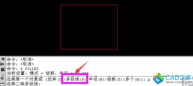 b.P選擇多段線,矩形4個角瞬間變成圓弧;