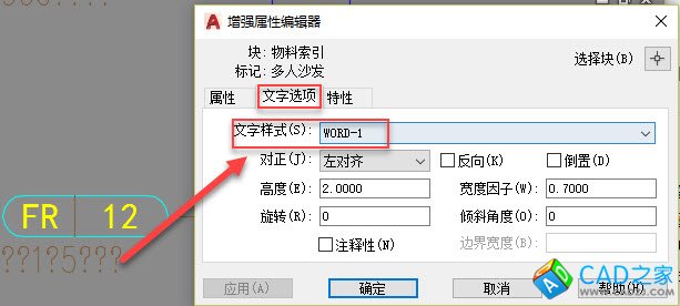 當遇到這類圖紙后,先看一下顯示問號的文字使用的文字樣式。如果是普通的文字對象,選中文字,直接LI查詢或在特性面板(CTRL+1)中查看一下文字樣式。如果文字是圖塊的屬性文字,可以雙擊屬性塊,在彈出的編輯屬性文字對話框中選中屬性后,單擊“文字選項”選項卡,可以看到使用的文字樣式,如下圖所示。