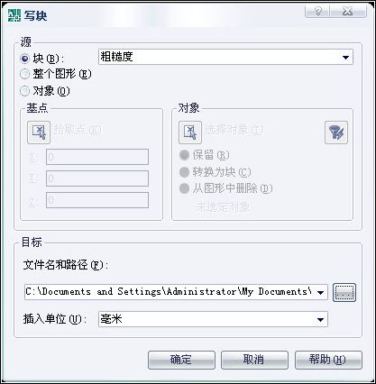 其實(shí)“寫塊”對(duì)話框不光可以將塊以文件的形式保存,也可以將對(duì)象和整個(gè)當(dāng)前的圖形文件以文件的形式保存。