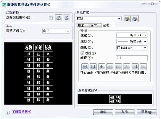 “邊框”選項卡中,“雙線間距:0.3”,邊框特性選擇第二個按鈕“外邊框”。