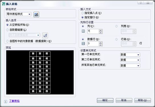“插入方式”選擇“指定窗口”,“列和行設(shè)置”選項組中——“列:7”,“數(shù)據(jù)行:3”,“設(shè)置單元樣式”選項組中“第一行單元樣式”、“第二行單元樣式”和“所有其他行單元樣式”均選擇“數(shù)據(jù)”。(這里是自己亂琢磨的,因為昨天繪制表格一直處理不好)