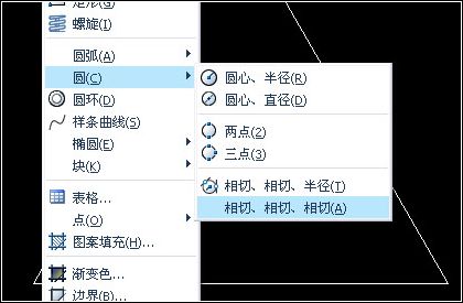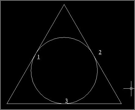 當已知3個實體對象相切時,可以利用這種方法繪制圓。菜單欄【繪圖】——“圓”,然后在子菜單中進行選擇“相切、相切、相切”命令,利用對象捕捉功能選擇三角形的1、2、3三個點。命令行提示如下所示: