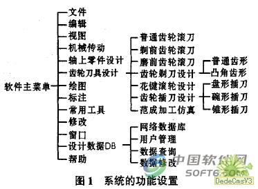 本軟件系統設置了包括6 類9 種齒輪刀具的輔助設計功能和刀具設計數據庫(見圖1)。系統除可完成齒輪刀具的輔助設計外,還開發了常見的機械傳動設計功能,如齒輪變速箱的自動設計等;并開發了二維繪圖和顯示功能,可對自動生成的刀具工作圖進行修改和縮放,從而拓展了軟件的使用范圍。