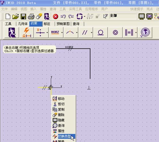 繪制技巧:點擊工具欄上的快速繪圖命令,把光標先放到坐標原點,然后慢慢往上(或下,左,右,視需要而定)移,會出現一條虛線,延虛線方向任意點一點,作為直線起點。確定起點后,往右平移鼠標,利用自動約束,畫一水平直線。
